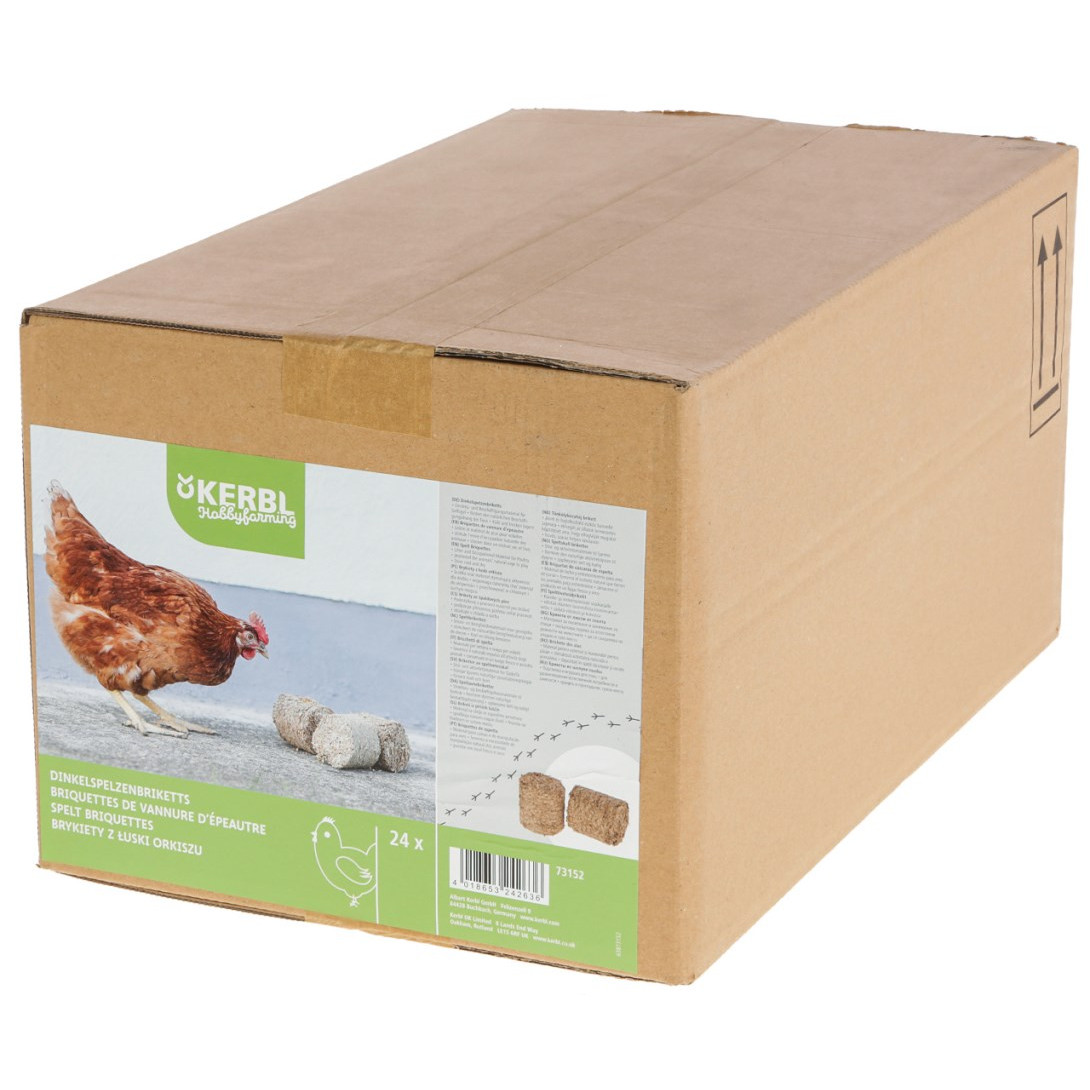 Materiale di attività per il pollame. Rimane attraente e vario per tutti i tipi di pollame. Può prevenire comportamenti aggressivi e beccate reciproche. Può essere offerto agli animali a terra o in una cesta sospesa. I bricchetti si disintegrano quando i polli li beccano e poi fungono da lettiera assorbente. Particolarmente attraente durante la stagione fredda e umida.