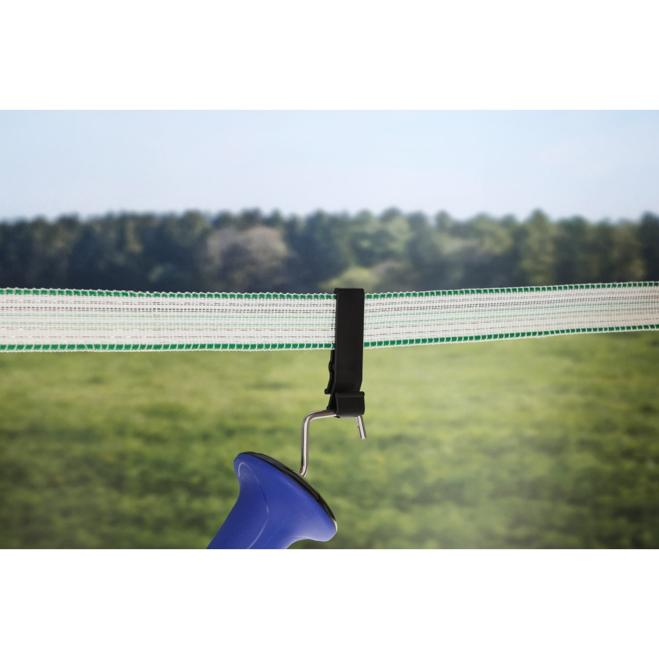Per fissare le maniglie del cancello quando il cancello è aperto. Evita pericolosi rischi di inciampo e contaminazione del materiale conduttore e della maniglia del cancello. Nessuna dispersione di potenza dal materiale conduttore steso a terra. Adatto per nastri da recinzione fino a max. Larghezza 40 mm, funi fino a 8 mm di diametro e fili.